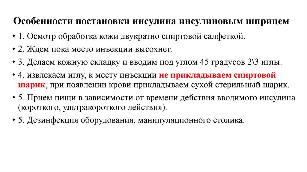 Особенности постановки инсулина инсулиновым шприцем• 1. Осмотр обработка кожи двукратно спиртовой салфеткой.