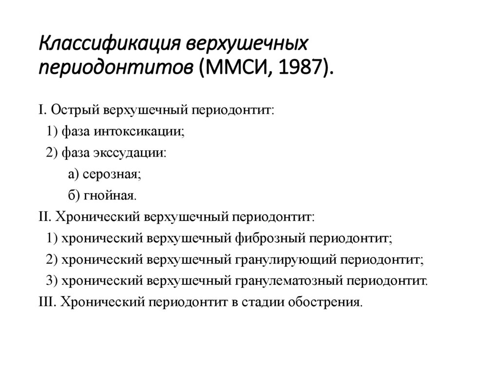 Классификация верхушечныхпериодонтитов (ММСИ, 1987).