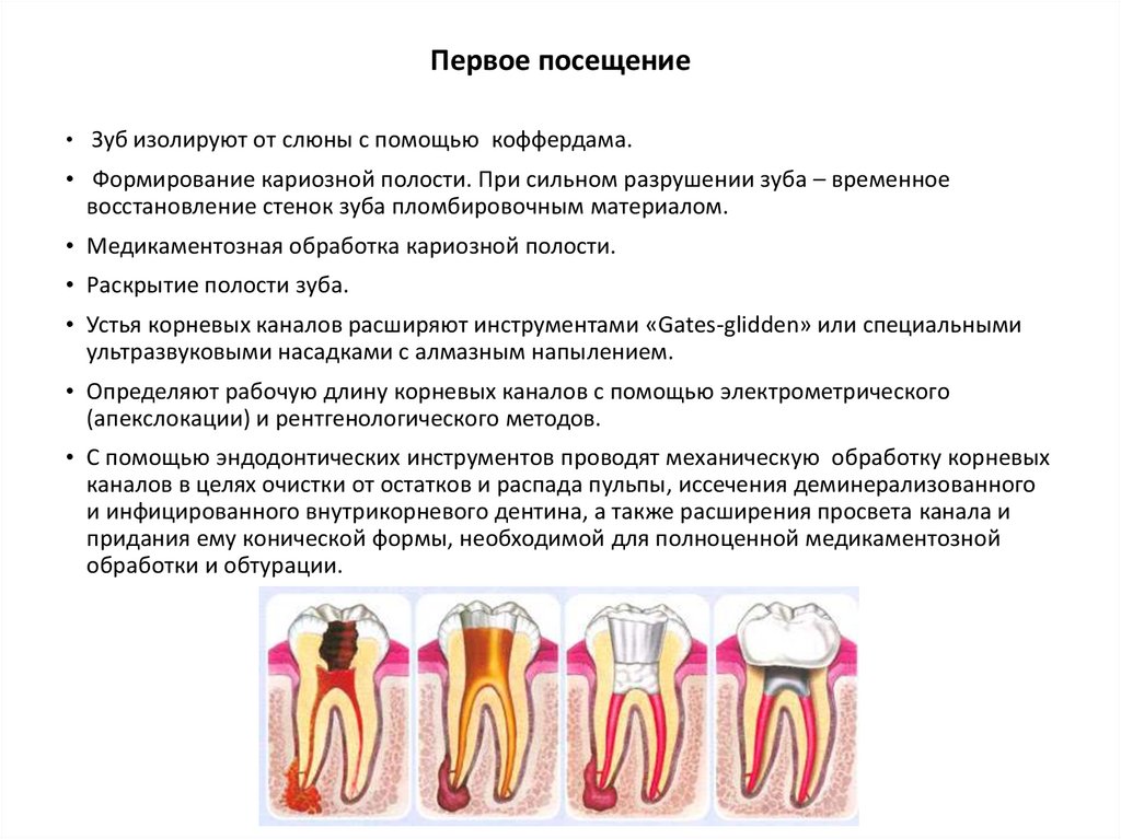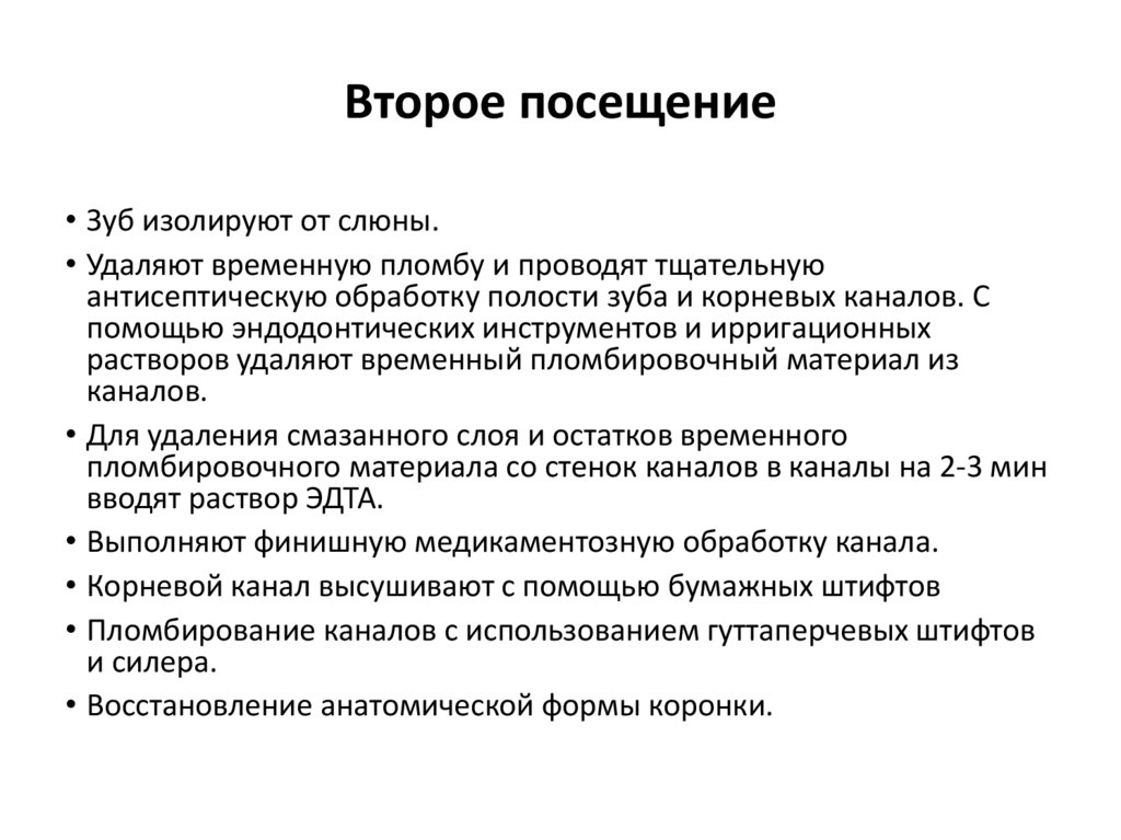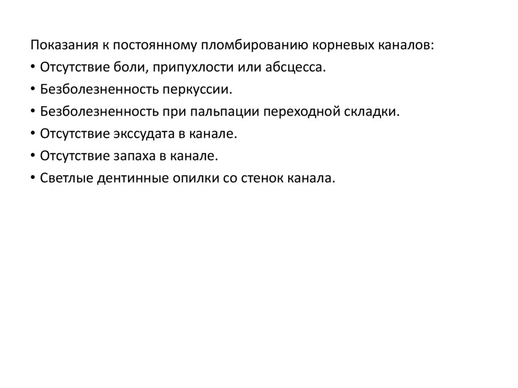 Показания к постоянному пломбированию корневых каналов:• Отсутствие боли, припухлости или абсцесса.
