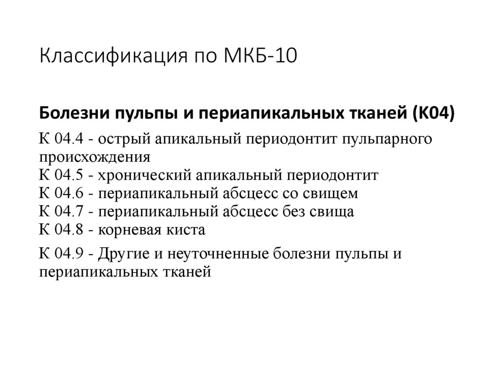 Классификация по МКБ-10Болезни пульпы и периапикальных тканей (K04)