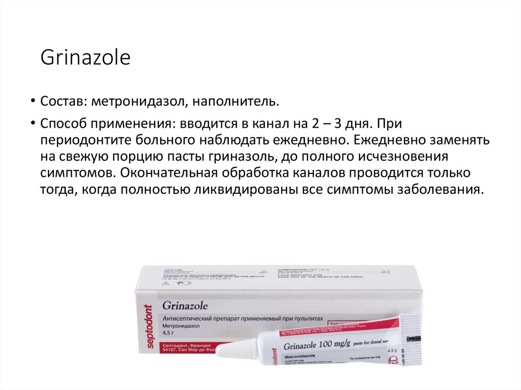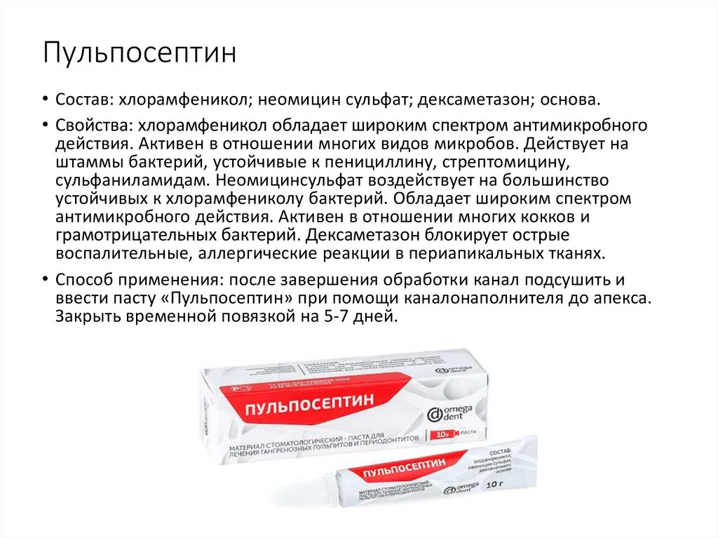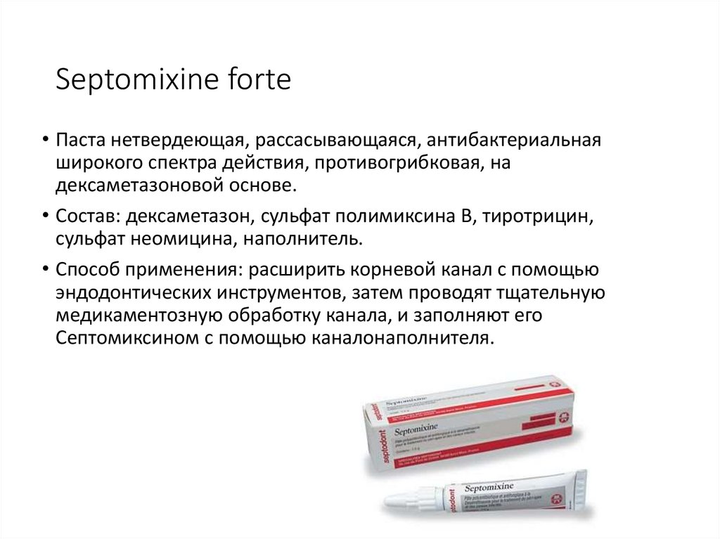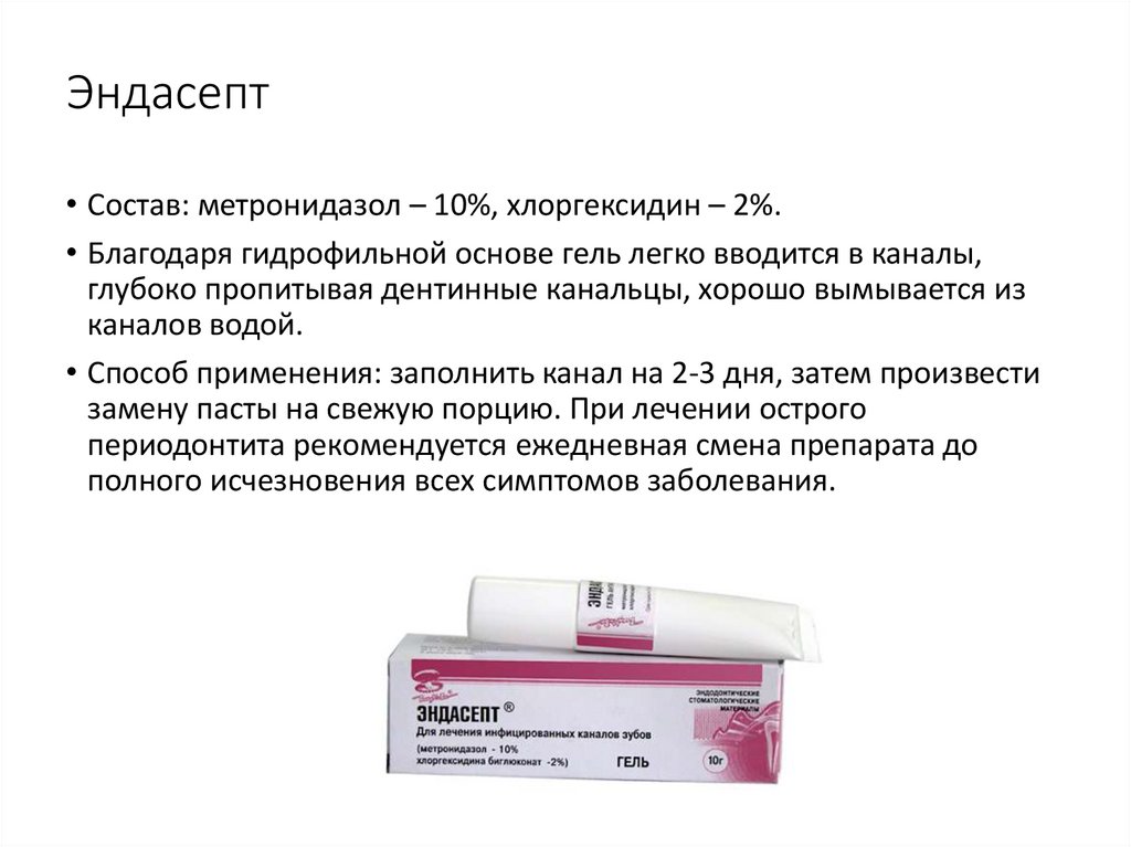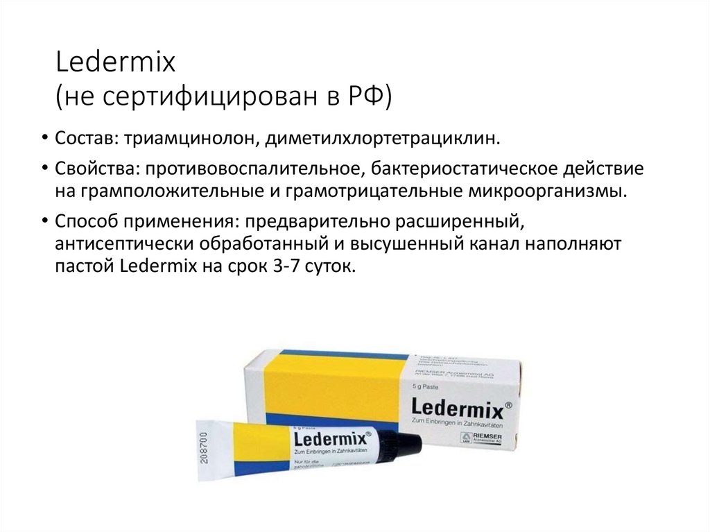 Состав: гидроксид кальция 52%, гуттаперча – 42%, хлорид натрия,