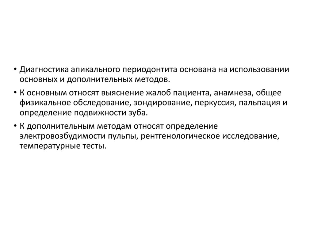 • Диагностика апикального периодонтита основана на использованииосновных и дополнительных методов.