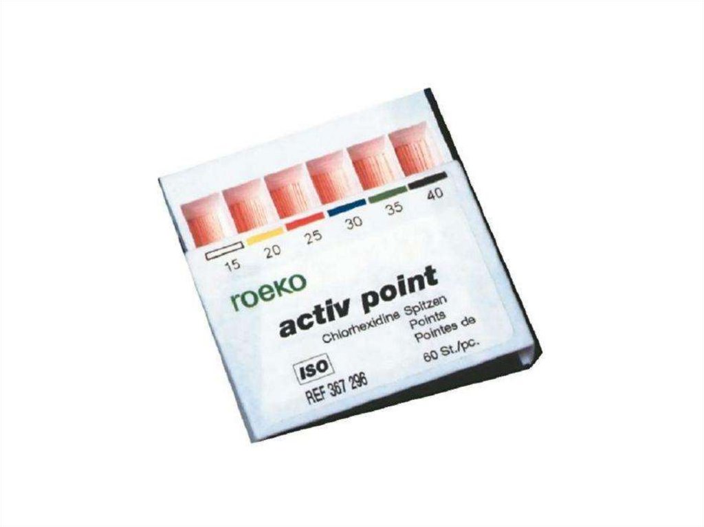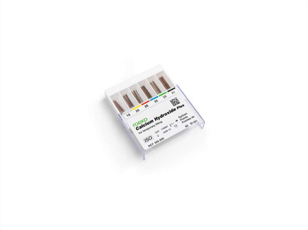 ионов. Штифты соответствуют нормам ISO и окрашены в светлокоричневый цвет, чтобы не спутать с гуттаперчевыми штифтами.