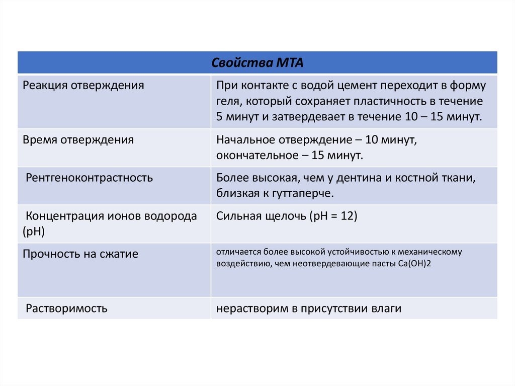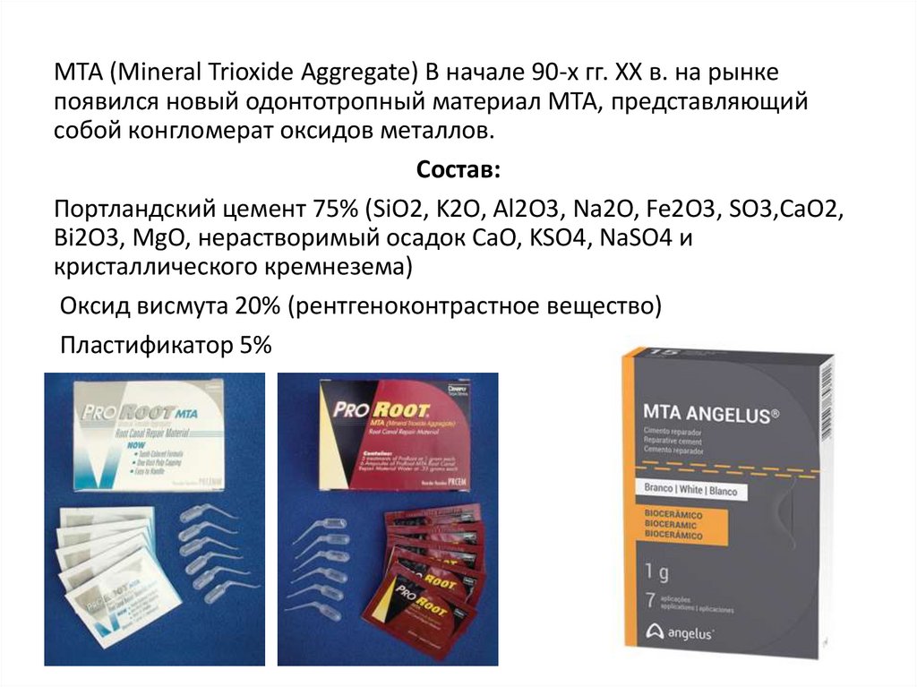 МТА (Mineral Trioxide Aggregate) В начале 90-х гг. XX в. на рынкепоявился новый одонтотропный материал МТА, представляющий