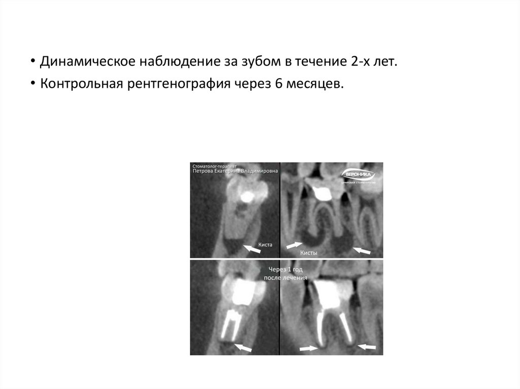• Динамическое наблюдение за зубом в течение 2-х лет.• Контрольная рентгенография через 6 месяцев.