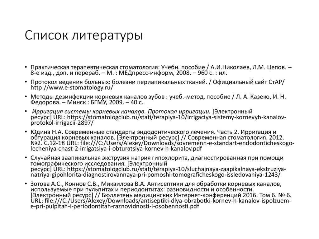 • Юдина Н.А. Современные стандарты эндодонтического лечения. Часть 2. Ирригация и