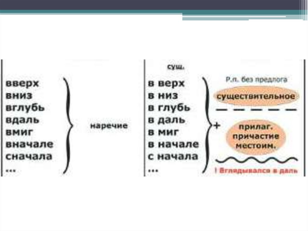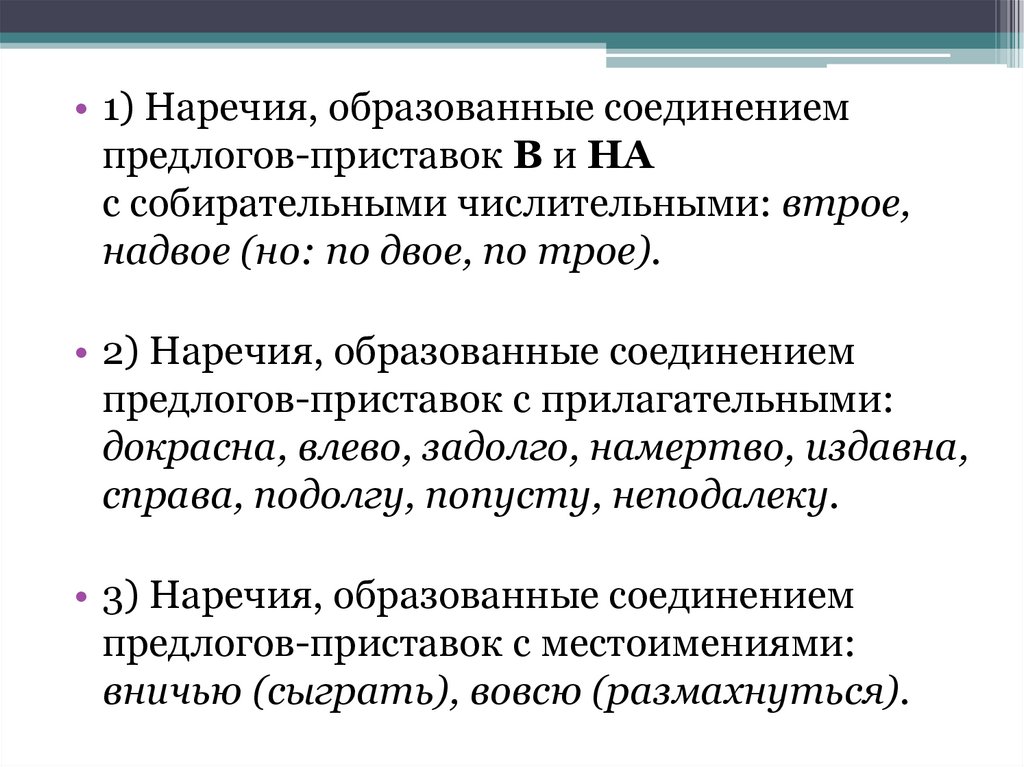 • 1) Наречия, образованные соединениемпредлогов-приставок В и НА
