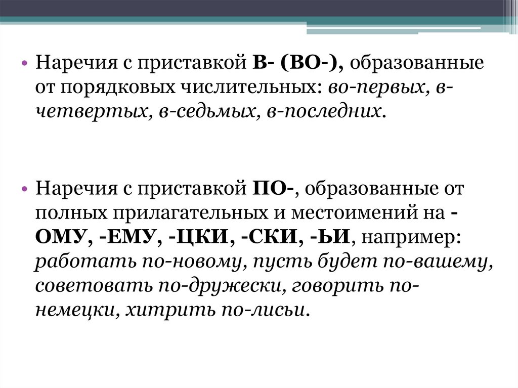 • Наречия с приставкой В- (ВО-), образованныеот порядковых числительных: во-первых, вчетвертых, в-седьмых, в-последних.