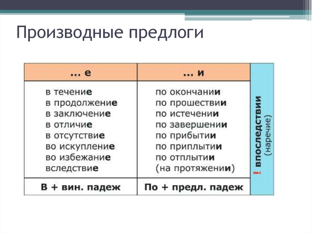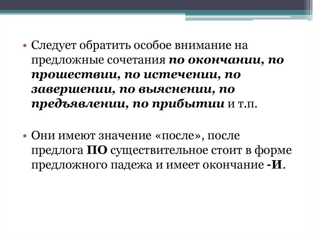 • Следует обратить особое внимание напредложные сочетания по окончании, по