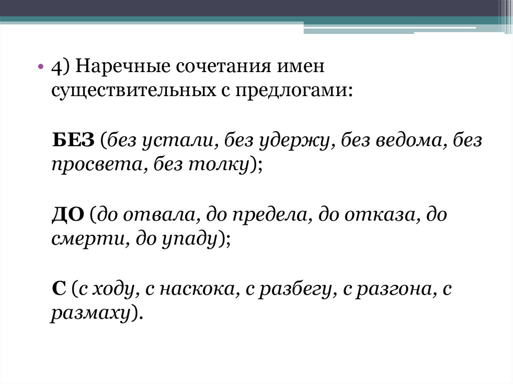 • 4) Наречные сочетания именсуществительных с предлогами: