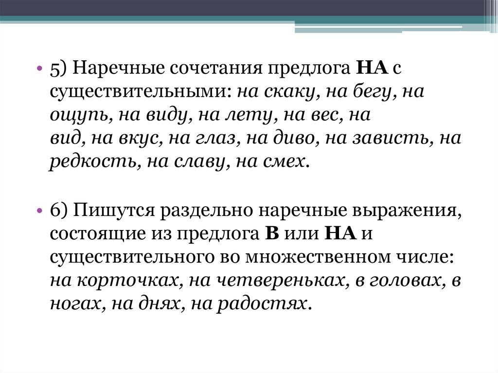 • 5) Наречные сочетания предлога НА ссуществительными: на скаку, на бегу, на
