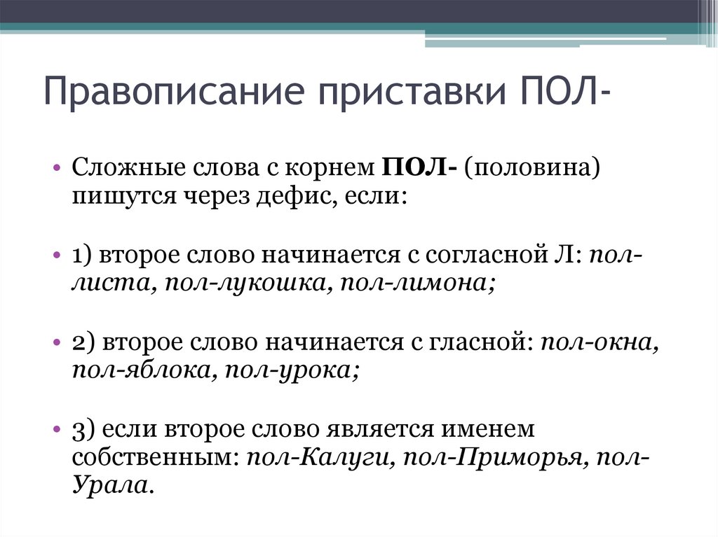 Правописание приставки ПОЛ• Сложные слова с корнем ПОЛ- (половина)пишутся через дефис, если: