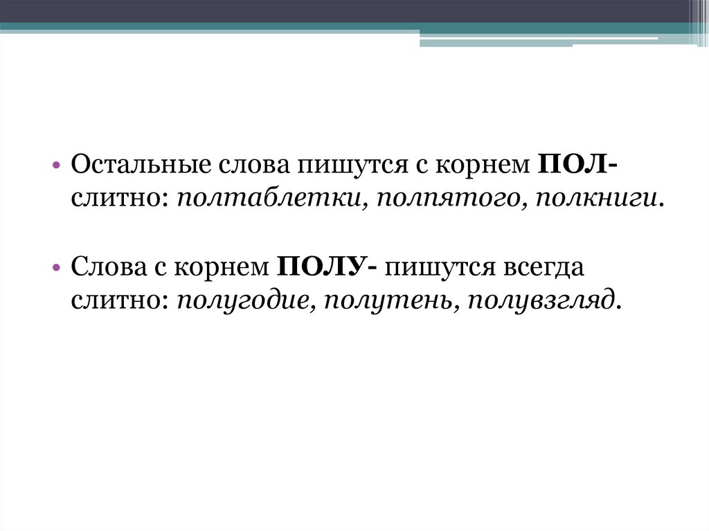 • Остальные слова пишутся с корнем ПОЛслитно: полтаблетки, полпятого, полкниги.• Слова с корнем ПОЛУ- пишутся всегда