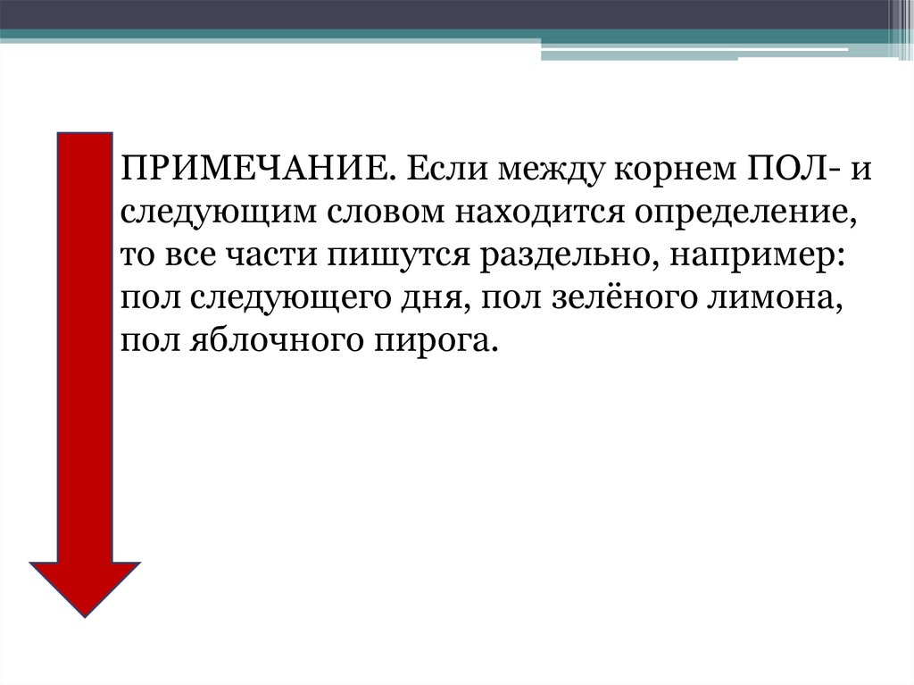 • ПРИМЕЧАНИЕ. Если между корнем ПОЛ- иследующим словом находится определение,