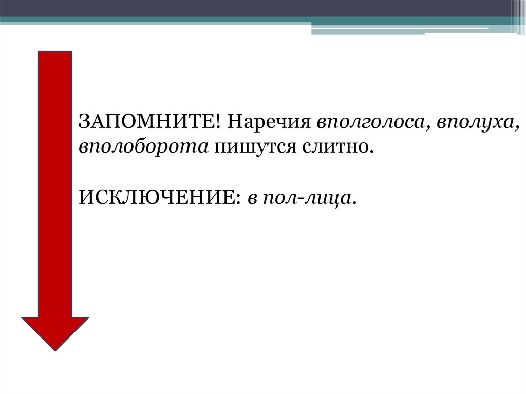 • ЗАПОМНИТЕ! Наречия вполголоса, вполуха,вполоборота пишутся слитно.