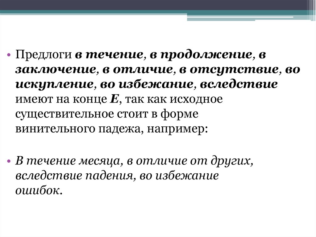 • Предлоги в течение, в продолжение, взаключение, в отличие, в отсутствие, во