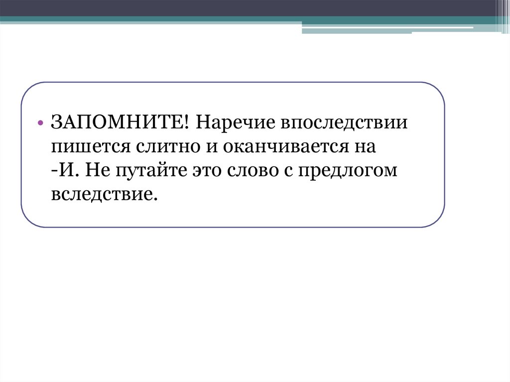 • ЗАПОМНИТЕ! Наречие впоследствиипишется слитно и оканчивается на