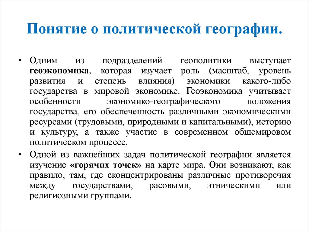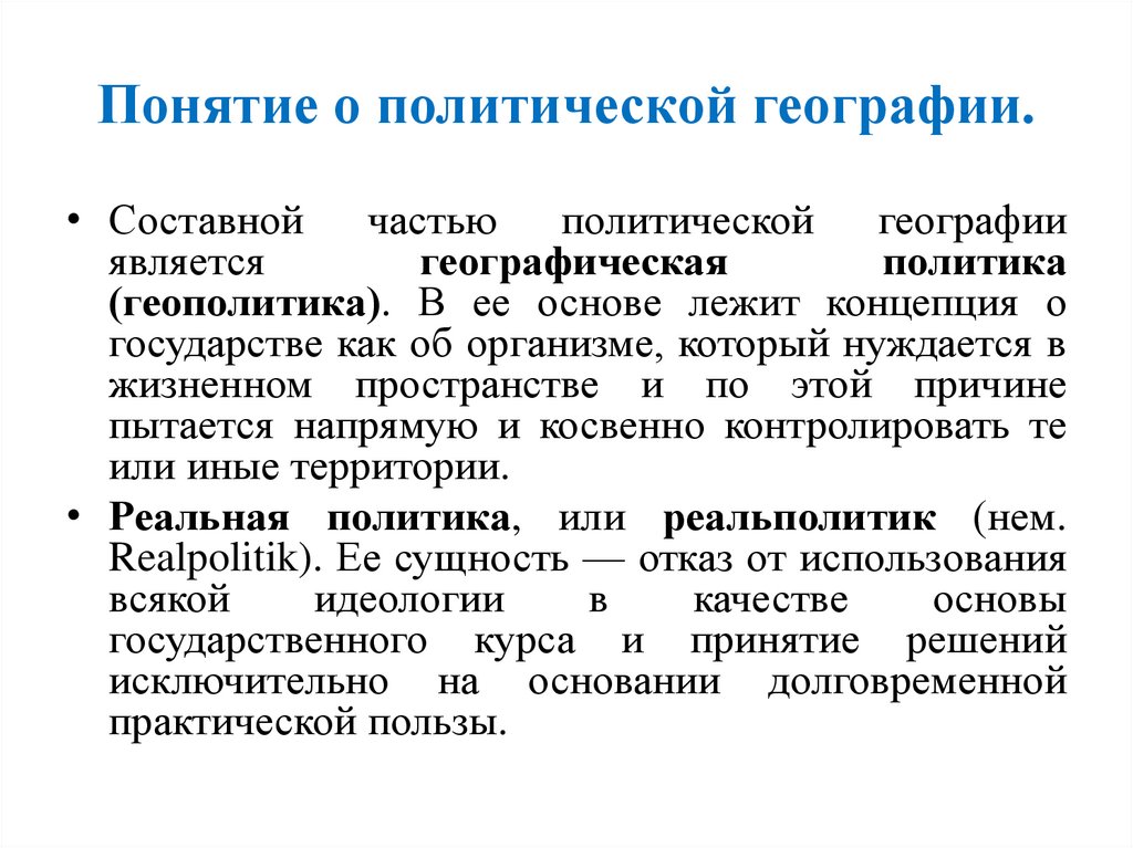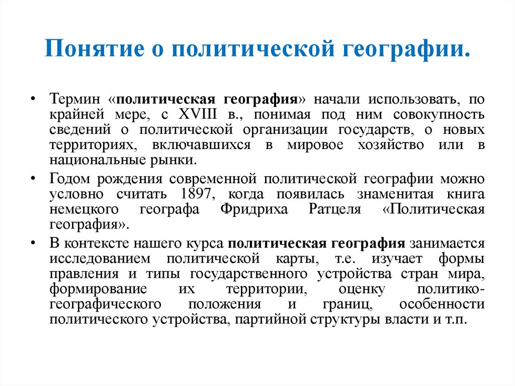 Понятие о политической географии.• Термин «политическая география» начали использовать, по
