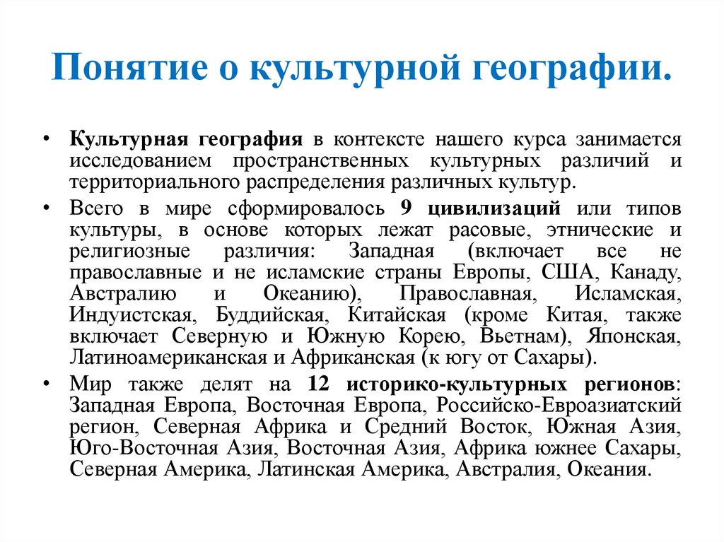 Понятие о культурной географии.• Культурная география в контексте нашего курса занимается