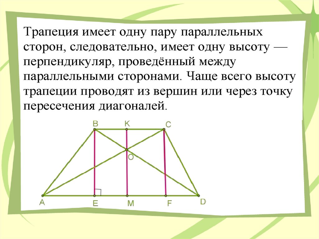 Трапеция имеет одну пару параллельныхсторон, следовательно, имеет одну высоту —