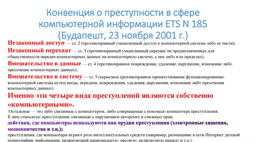Незаконный доступ — ст. 2 (противоправный умышленный доступ к компьютерной системе либо ее части);