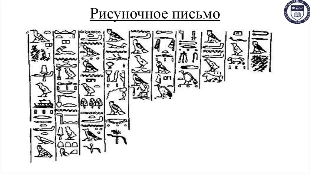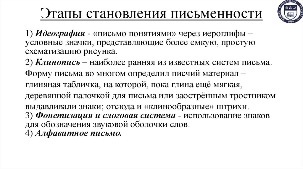 Этапы становления письменности1) Идеография - «письмо понятиями» через иероглифы –