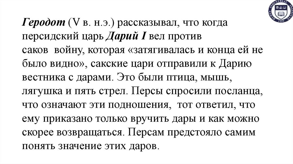 Геродот (V в. н.э.) рассказывал, что когдаперсидский царь Дарий I вел против
