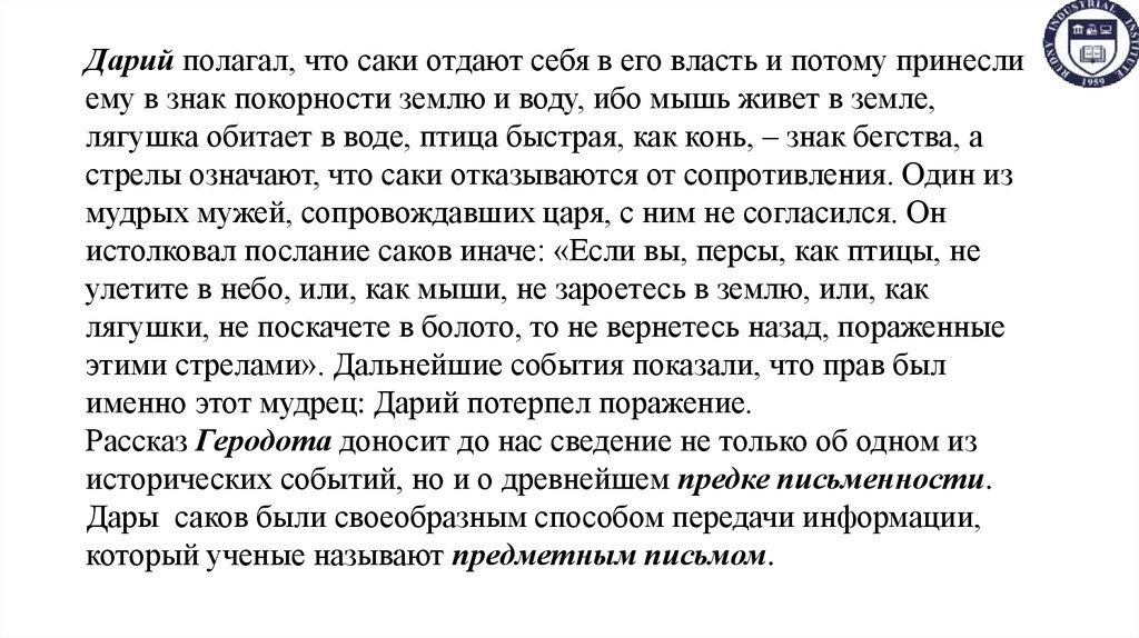 Дарий полагал, что саки отдают себя в его власть и потому принеслиему в знак покорности землю и воду, ибо мышь живет в земле,