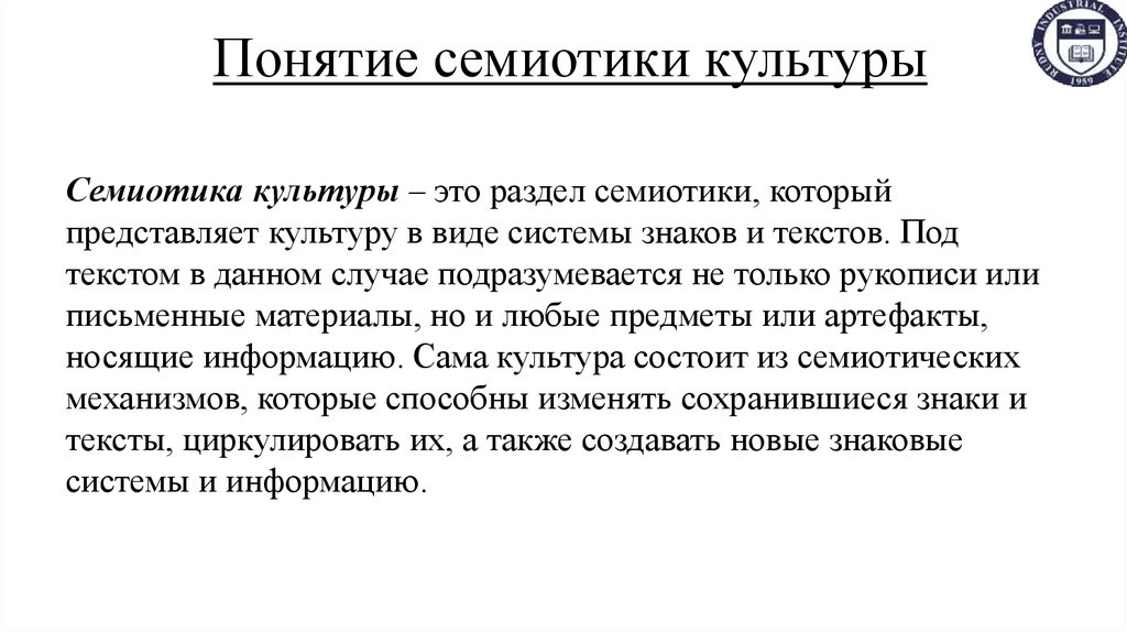 Понятие семиотики культурыСемиотика культуры – это раздел семиотики, который