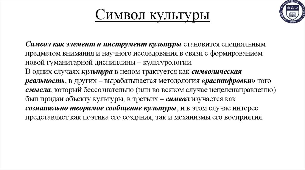 Символ культурыСимвол как элемент и инструмент культуры становится специальным