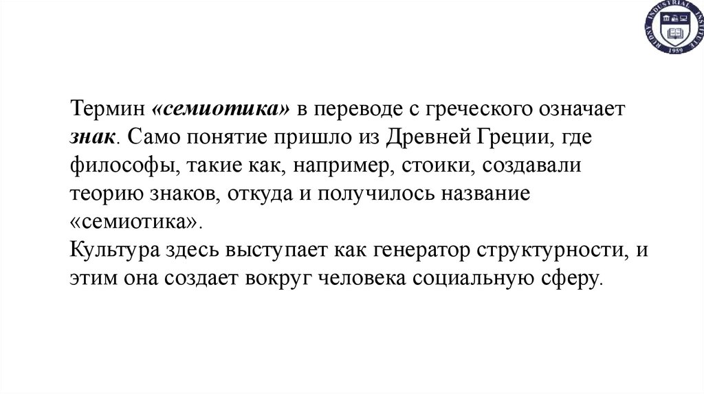 Термин «семиотика» в переводе с греческого означаетзнак. Само понятие пришло из Древней Греции, где
