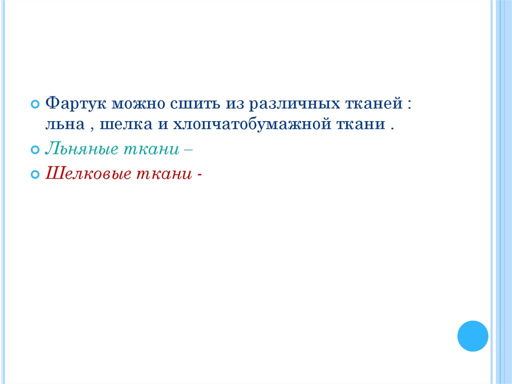 Фартук можно сшить из различных тканей :льна , шелка и хлопчатобумажной ткани .
