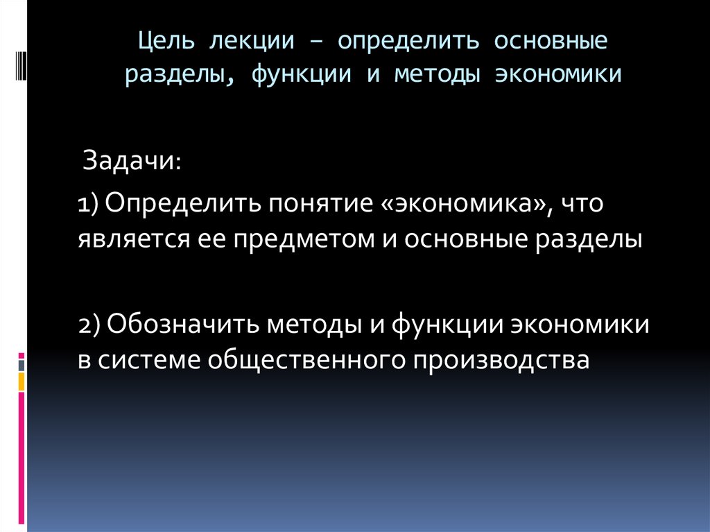 Цель лекции – определить основныеразделы, функции и методы экономики