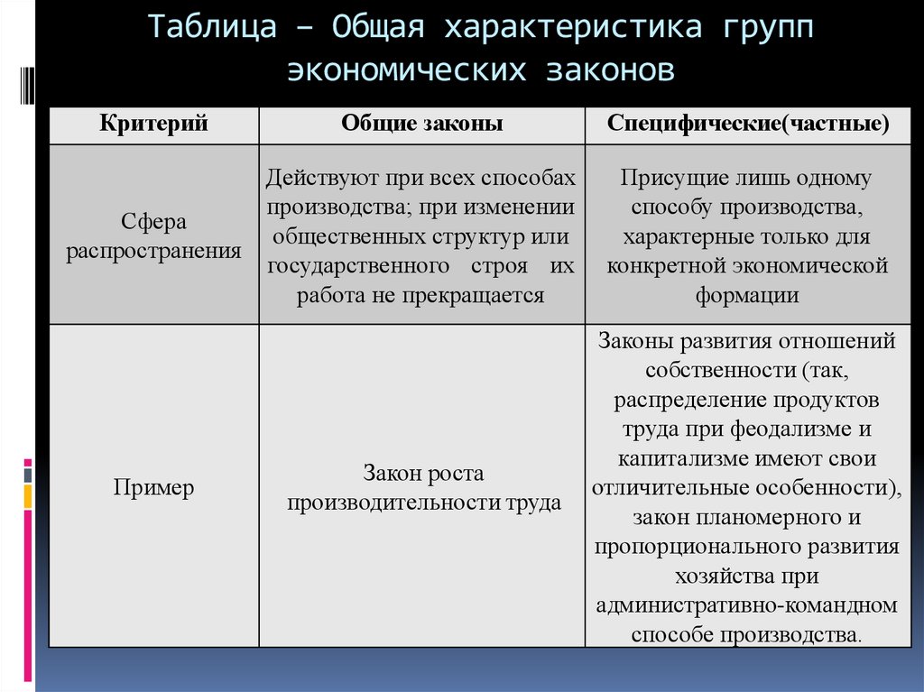 Таблица – Общая характеристика группэкономических законов