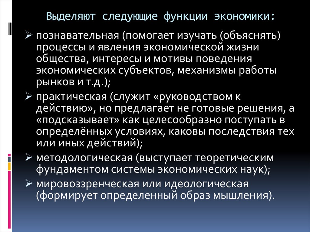 Выделяют следующие функции экономики:познавательная (помогает изучать (объяснять)