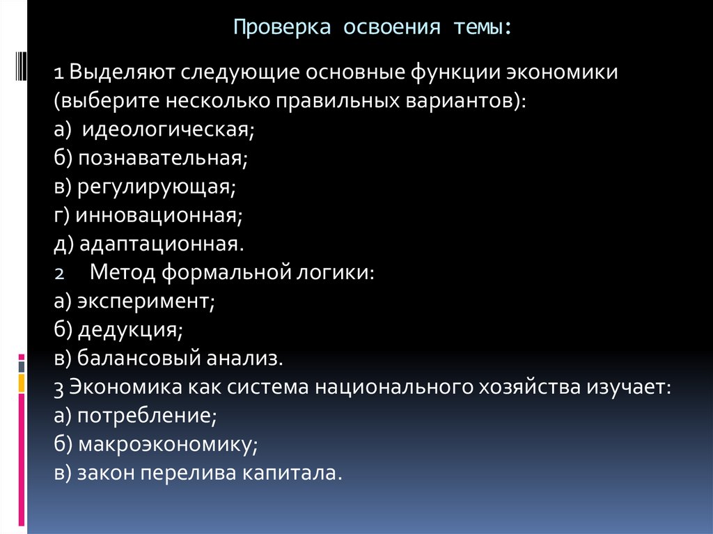 Проверка освоения темы:1 Выделяют следующие основные функции экономики