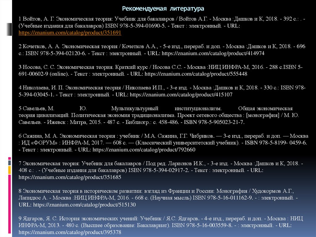 Рекомендуемая литература1 Войтов, А. Г. Экономическая теория: Учебник для бакалавров / Войтов А.Г. - Москва :Дашков и К, 2018. - 392 с.: . (Учебные издания для бакалавров) ISBN 978-5-394-01690-5. - Текст : электронный. - URL: