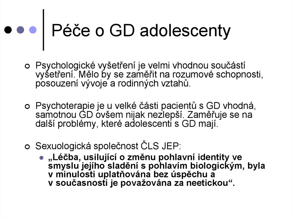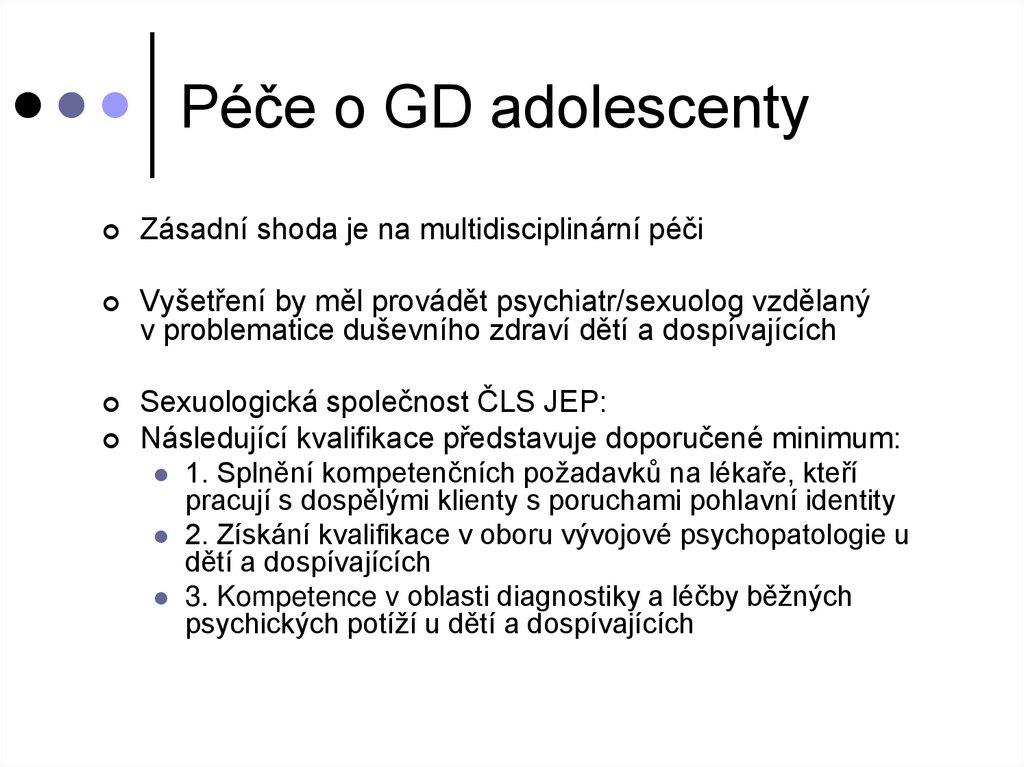 Zásadní shoda je na multidisciplinární péčiVyšetření by měl provádět psychiatr/sexuolog vzdělaný