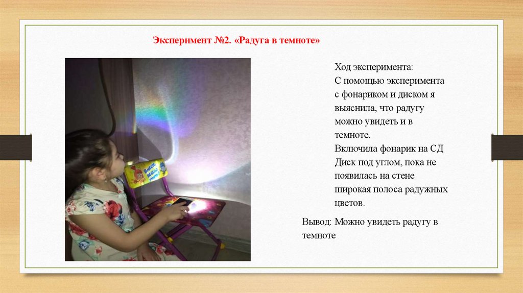 Эксперимент №2. «Радуга в темноте»Ход эксперимента: