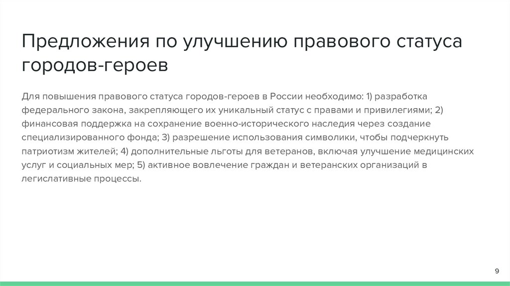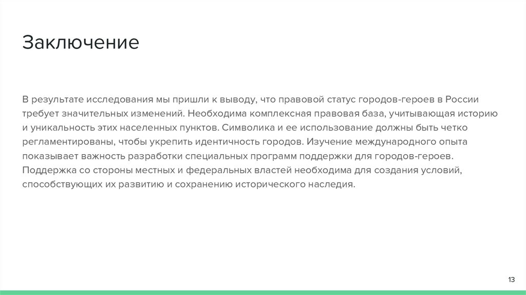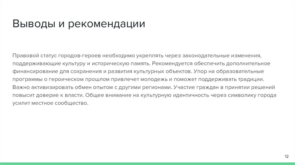 Выводы и рекомендацииПравовой статус городов-героев необходимо укреплять через законодательные изменения,