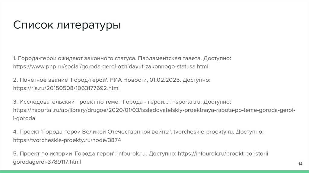 Список литературы1. Города-герои ожидают законного статуса. Парламентская газета. Доступно: