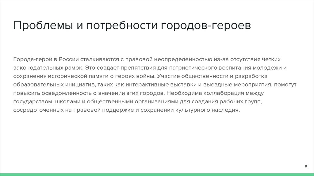 Проблемы и потребности городов-героевГорода-герои в России сталкиваются с правовой неопределенностью из-за отсутствия четких
