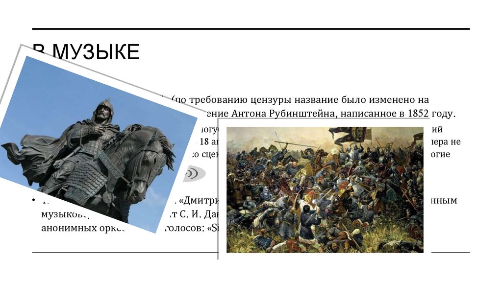 В МУЗЫКЕ• Опера «Дмитрий Донской» (по требованию цензуры название было изменено на