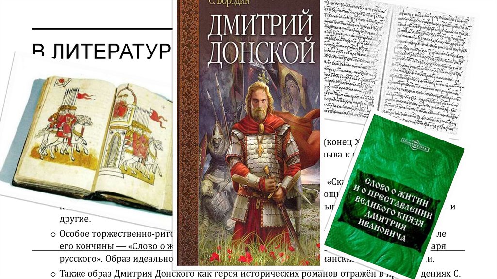 В ЛИТЕРАТУРЕ• Образ Дмитрия Ивановича Донского нашёл отражение в произведениях московской