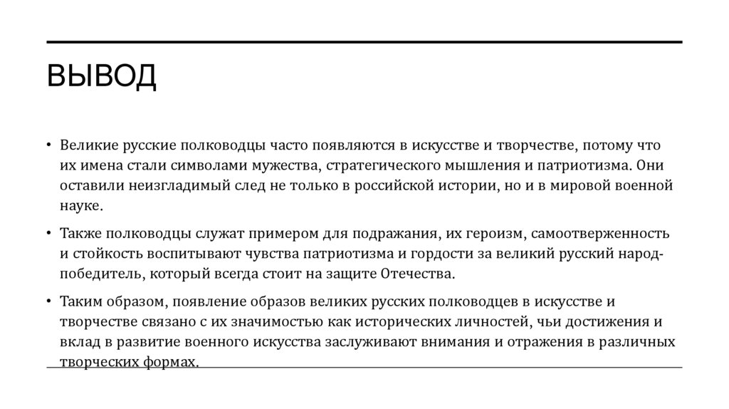 ВЫВОД• Великие русские полководцы часто появляются в искусстве и творчестве, потому что