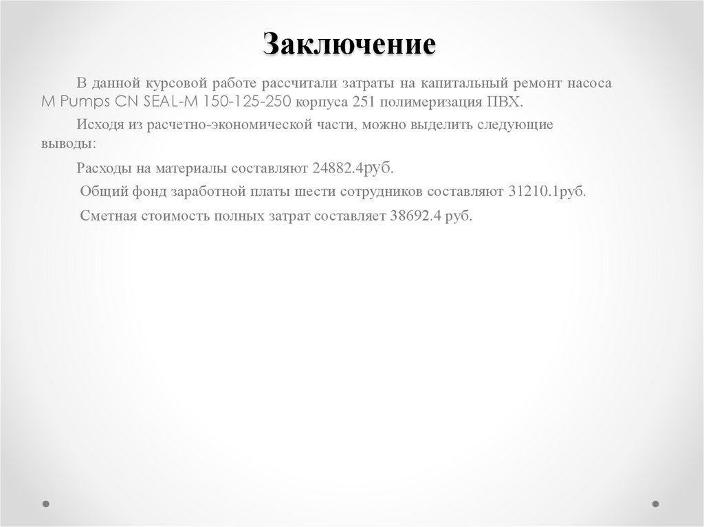 ЗаключениеВ данной курсовой работе рассчитали затраты на капитальный ремонт насоса