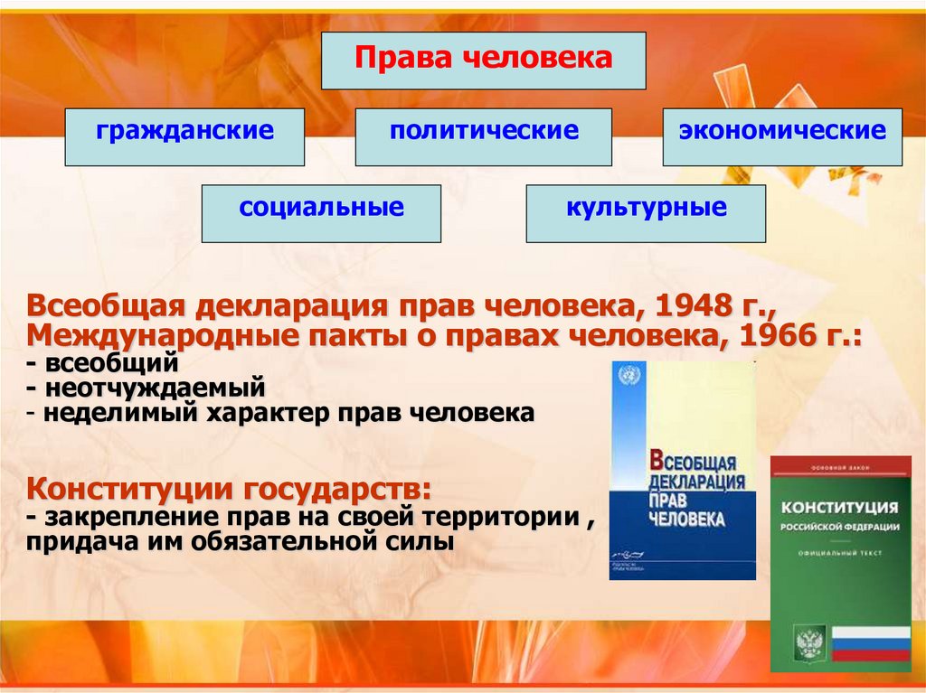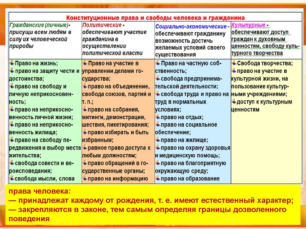 права человека:— принадлежат каждому от рождения, т. е. имеют естественный характер;