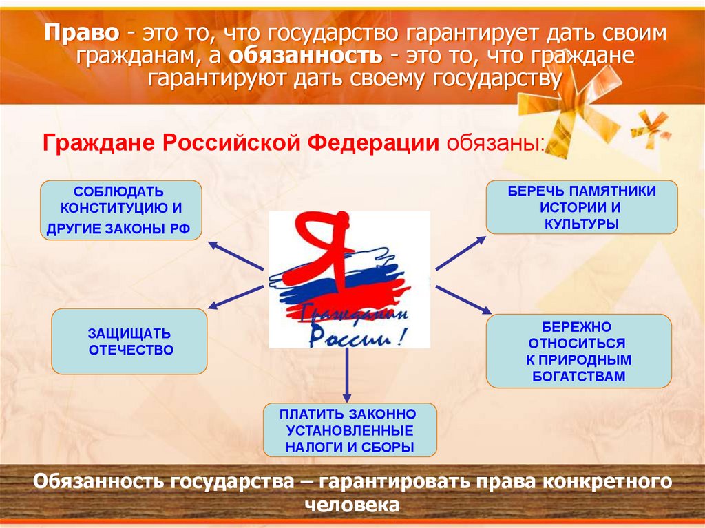 Право - это то, что государство гарантирует дать своимгражданам, а обязанность - это то, что граждане