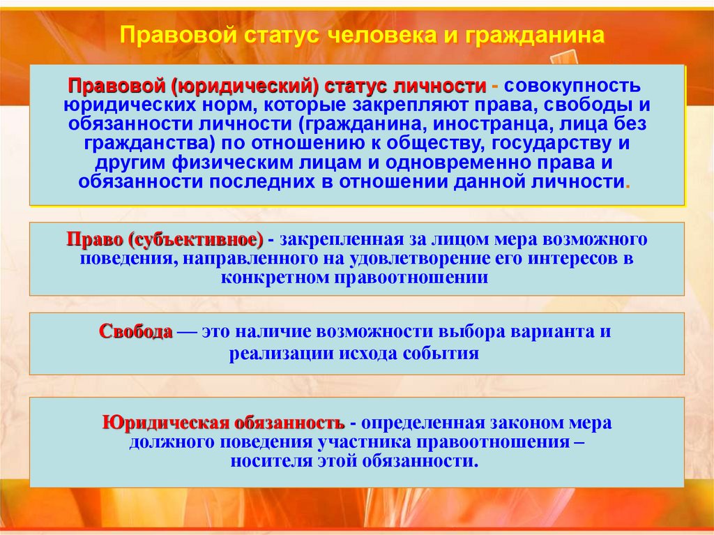 Правовой (юридический) статус личности - совокупностьюридических норм, которые закрепляют права, свободы и