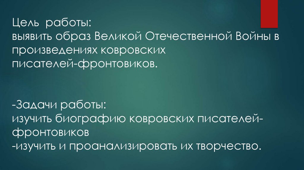 Цель работы:выявить образ Великой Отечественной Войны в